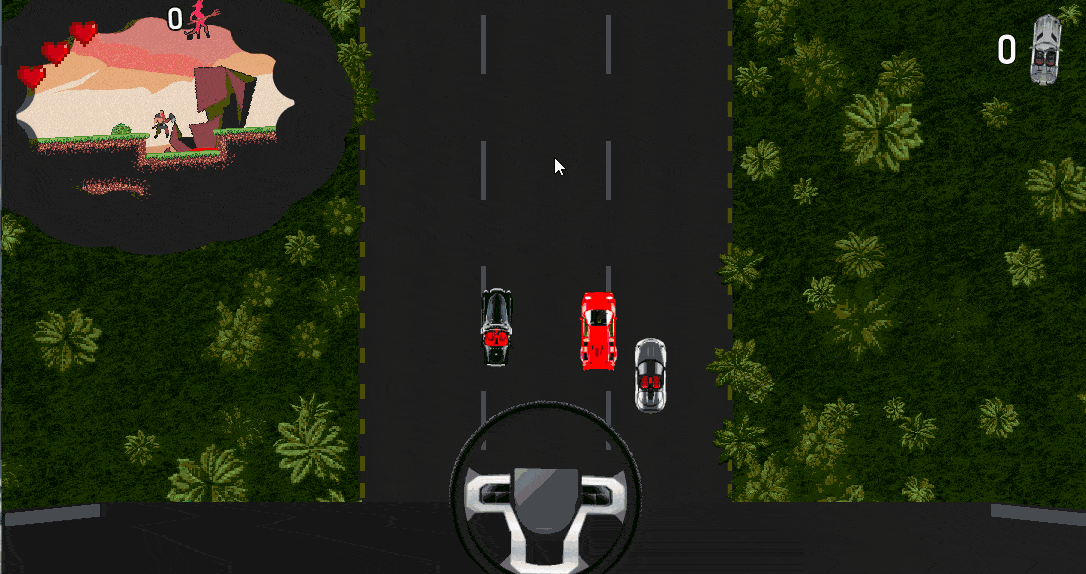 - You’re driving in a car to your boring 9/5 job imagining this magical platformer where you are the hero. Having to handle the real driving and surviving inside of your imagination (handling car with mouse movements and game with keys)